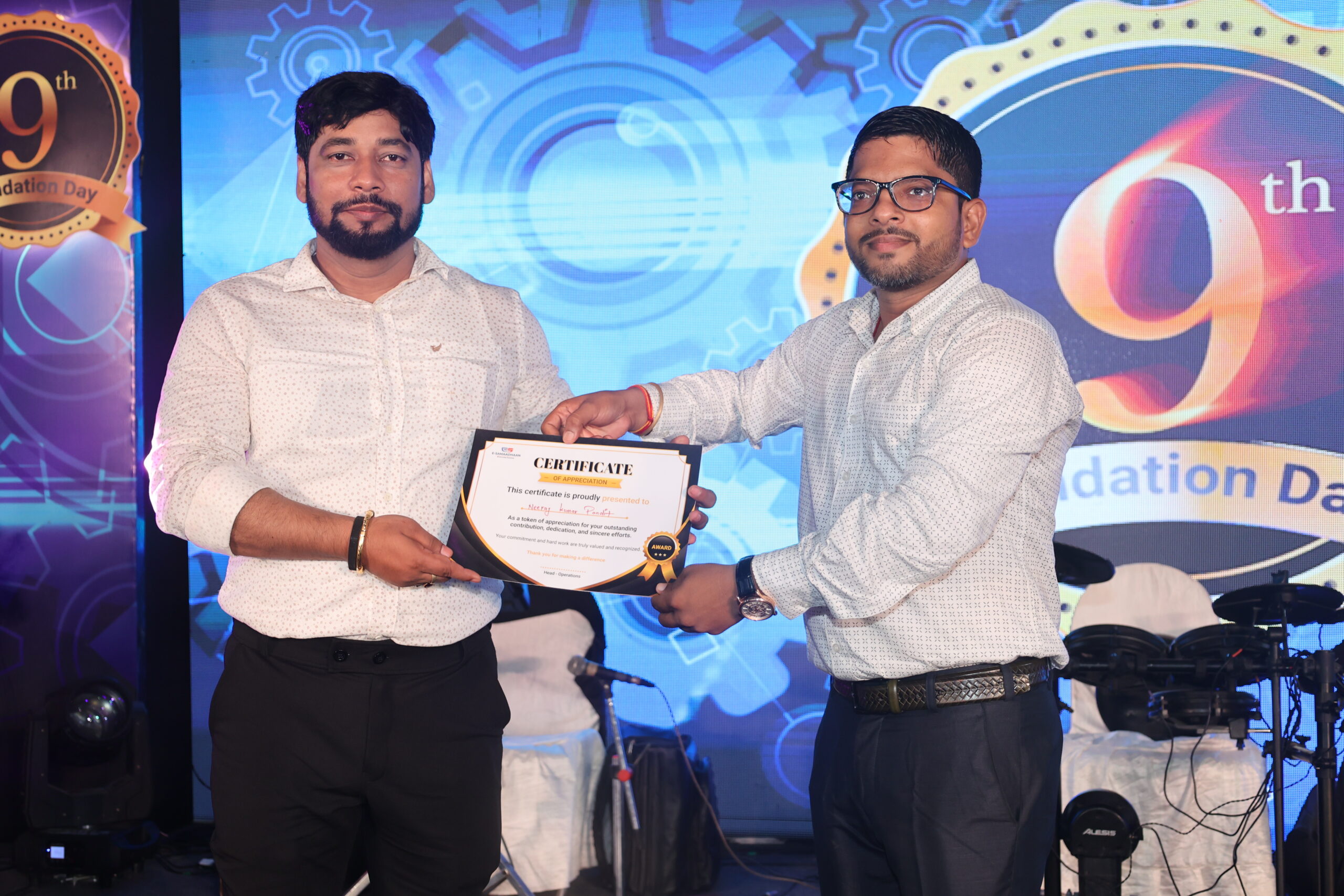 Kneeraj receiving certificate from founder and ceo rohit kumar singh esamaadhaan 9th foundation day